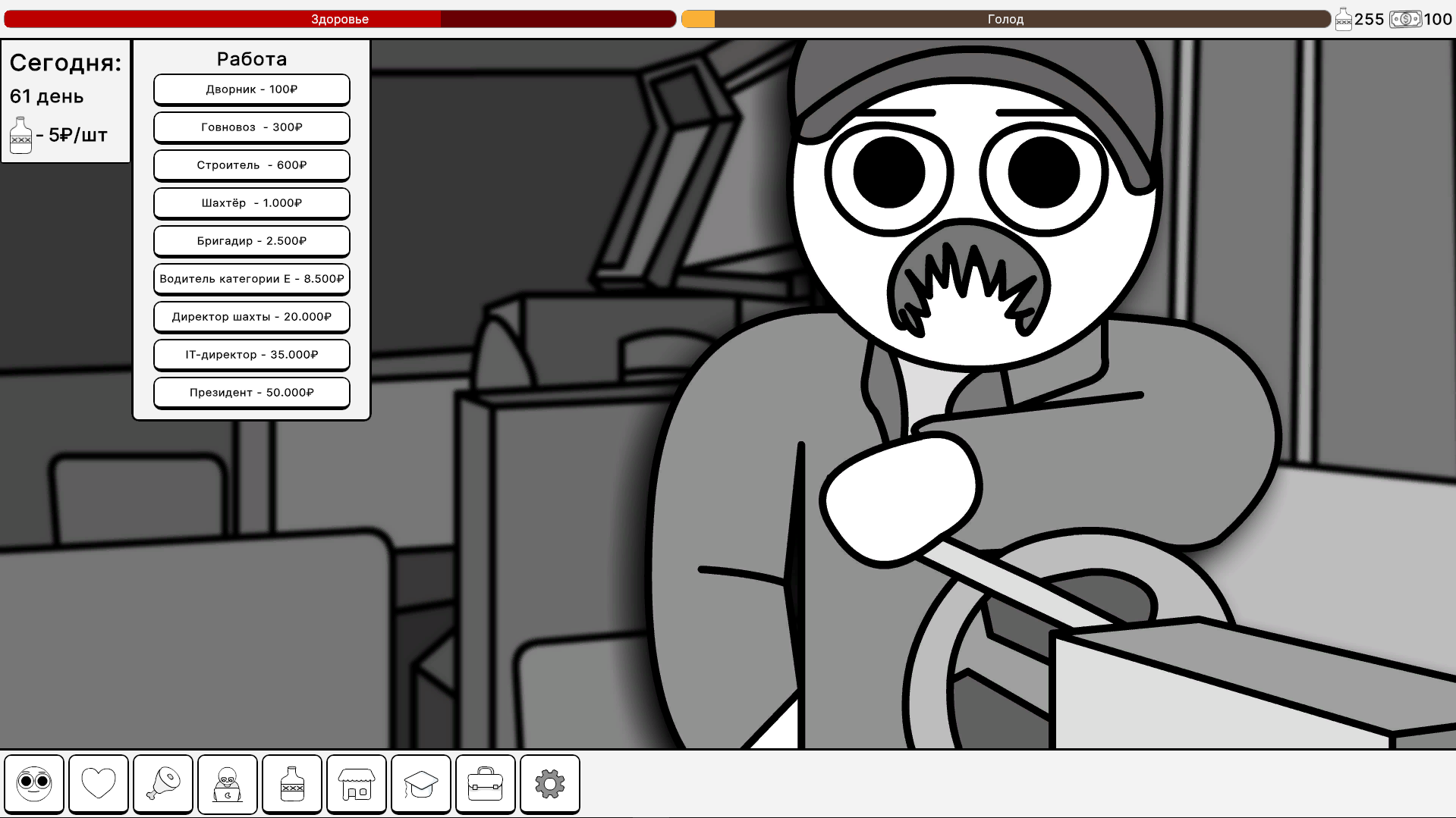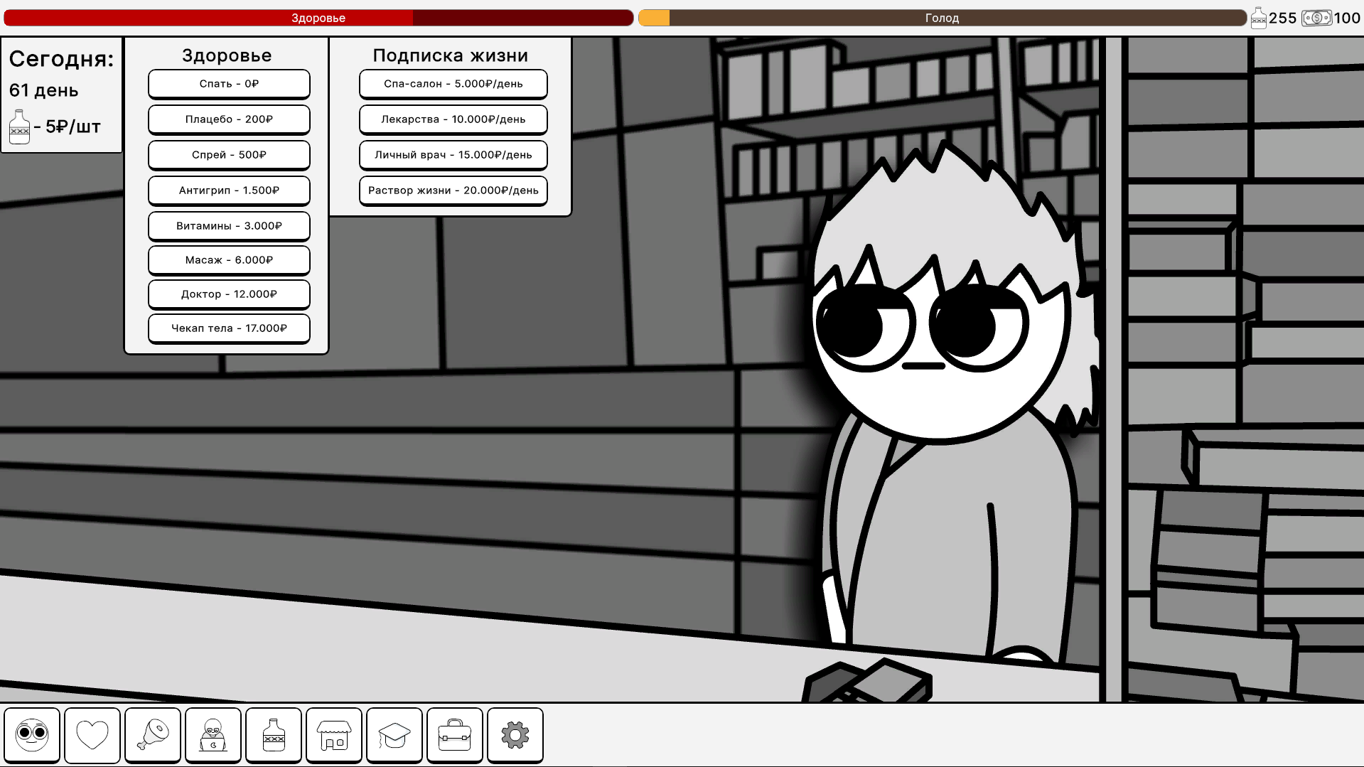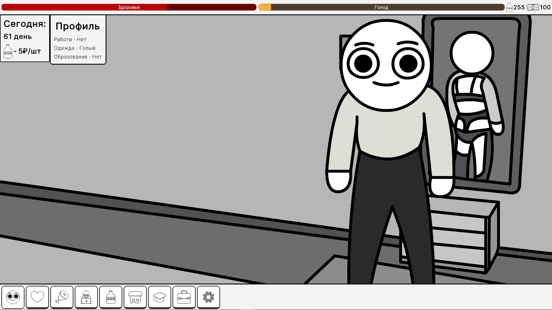 Начните с нуля: собирайте бутылки на улицах, чтобы заработать первые деньги, и постепенно развивайте свой бизнес, получайте образование, работайте на престижной работе. Покупайте стильную одежду в магазине, закупайте еду и лекарства для поддержания здоровья — все это меняет ваши статы: голод, финансы, здоровье. Геймплей построен на интуитивных нажатиях на кнопки: каждый клик — шаг к успеху! Развивайте персонажа, повышайте уровень, открывайте новые возможности и преодолевайте вызовы повседневной жизни. Красивые нарисованные фоны создают уютную атмосферу, от городских улиц до уютных квартир, погружая вас в виртуальный мир.