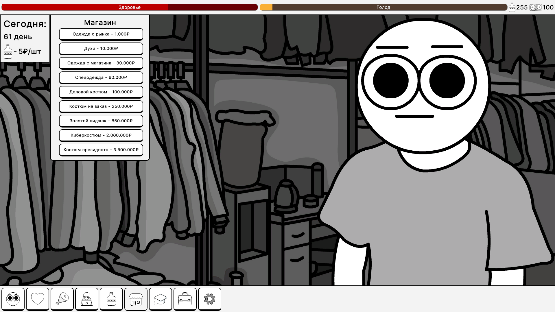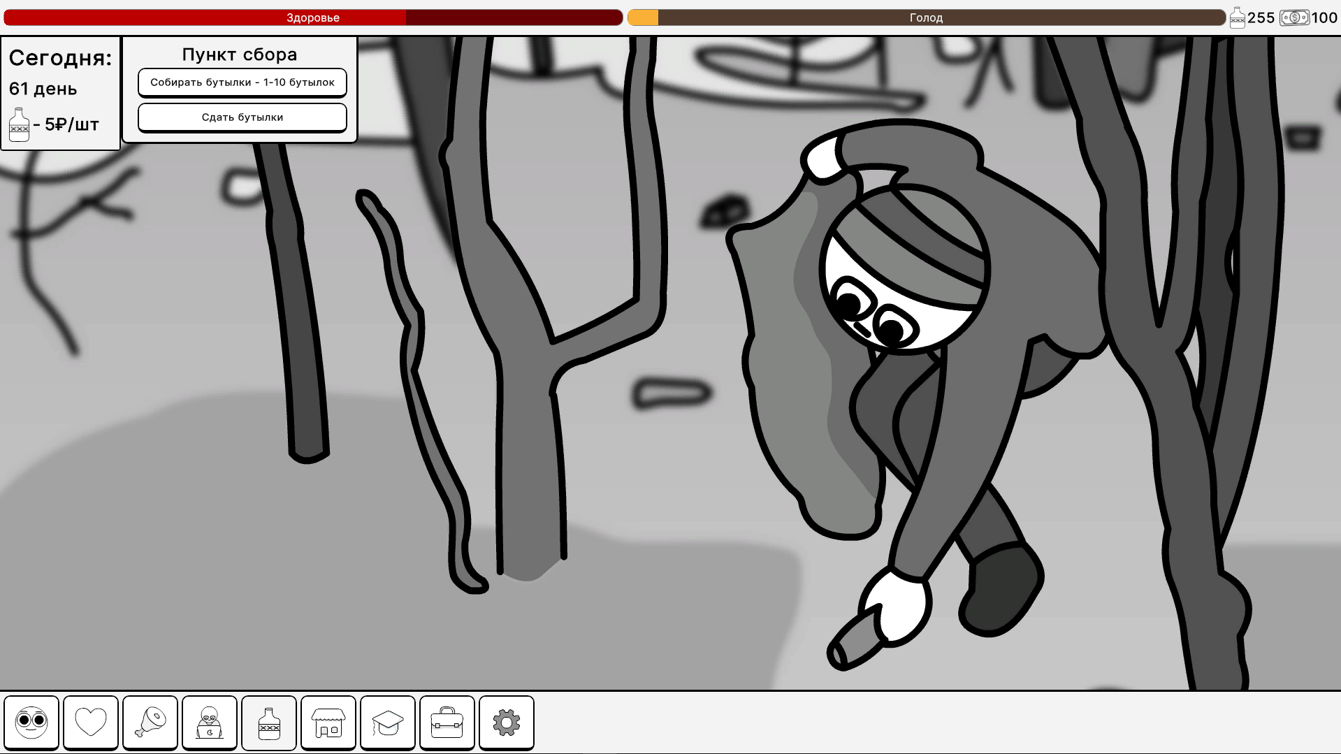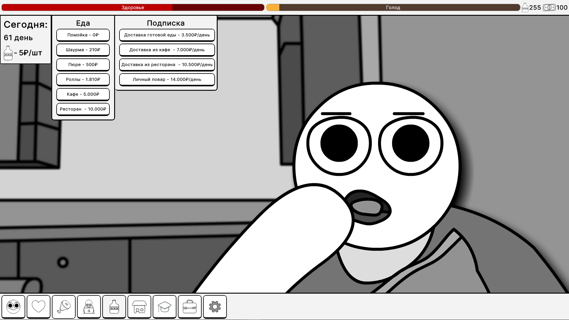 Начните с нуля: собирайте бутылки на улицах, чтобы заработать первые деньги, и постепенно развивайте свой бизнес, получайте образование, работайте на престижной работе. Покупайте стильную одежду в магазине, закупайте еду и лекарства для поддержания здоровья — все это меняет ваши статы: голод, финансы, здоровье. Геймплей построен на интуитивных нажатиях на кнопки: каждый клик — шаг к успеху! Развивайте персонажа, повышайте уровень, открывайте новые возможности и преодолевайте вызовы повседневной жизни. Красивые нарисованные фоны создают уютную атмосферу, от городских улиц до уютных квартир, погружая вас в виртуальный мир.
